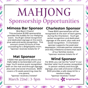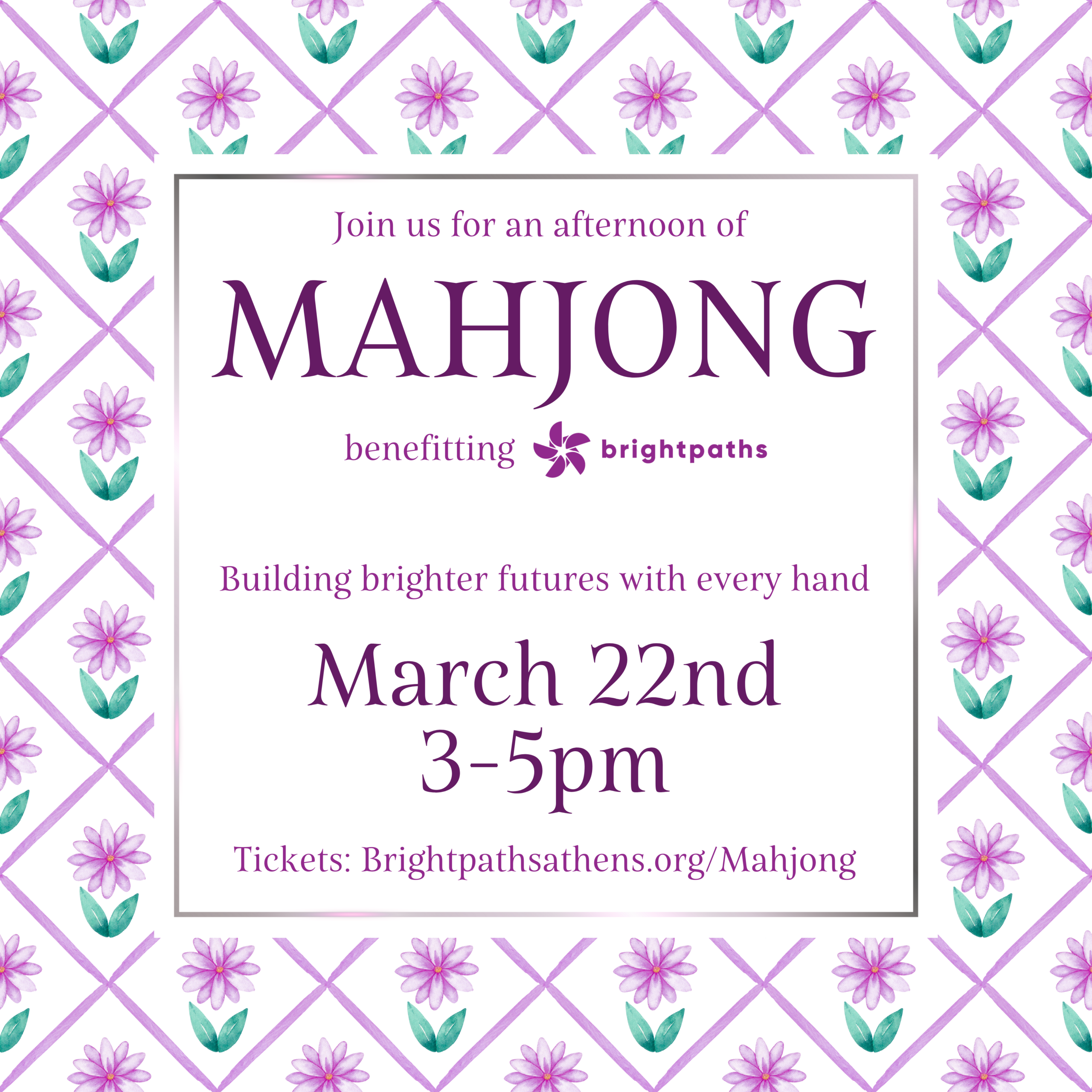 Join us for an afternoon of Mahjong, benefitting Brightpaths. Come with your foursome or on your own to meet other players! All materials and light refreshments provided. Hosted at the Copeland residence in Five Points.